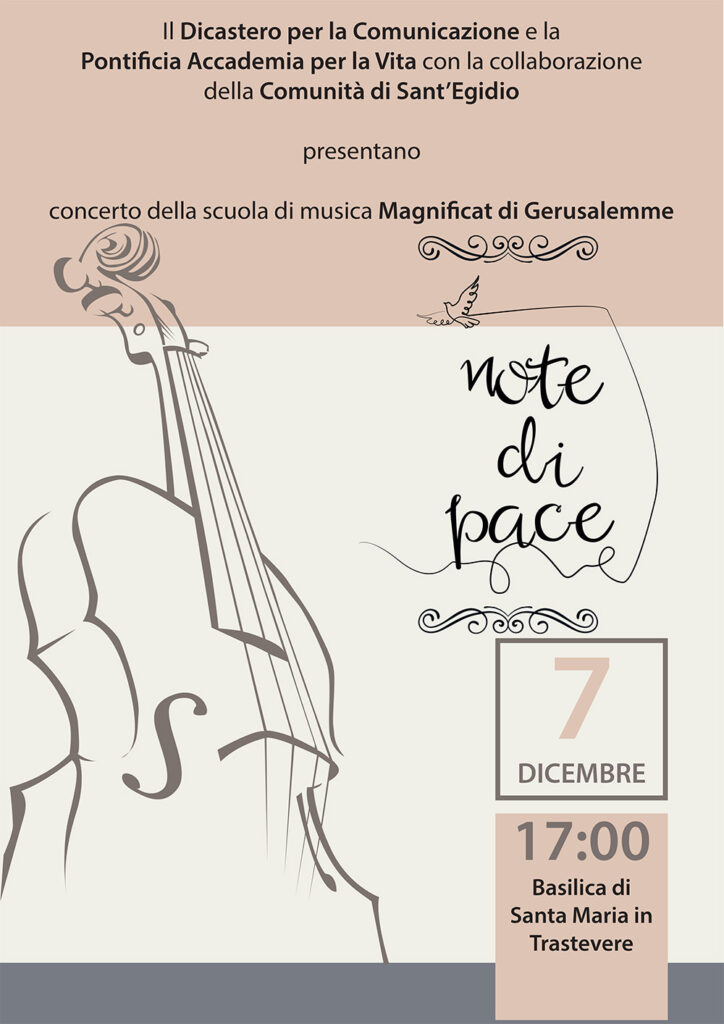 Il Dicastero per la Comunicazione e la Pontificia Accademia per la Vita hanno unito le forze per presentare il concerto della Scuola Magnificat, dal suggestivo titolo “Note di Pace”. L’evento, organizzato in collaborazione con la Comunità di Sant’Egidio, si terrà giovedì 7 dicembre alle ore 17 presso la Basilica di Santa Maria in Trastevere.