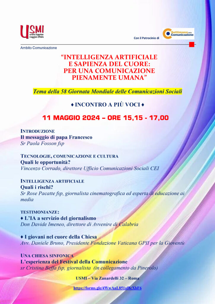 Il giorno 11 maggio 2024, dalle ore 15.15 alle 17.00, la sede nazionale dell’USMI a Roma di via Zanardelli 32, diventerà il palcoscenico di un importante evento a più voci intitolato “Intelligenza artificiale e sapienza del cuore: per una comunicazione pienamente umana”. Questo appuntamento si propone di esplorare le sfide e le opportunità presentate dall’intelligenza artificiale, con un occhio di riguardo verso il mantenimento di una comunicazione profondamente umana.